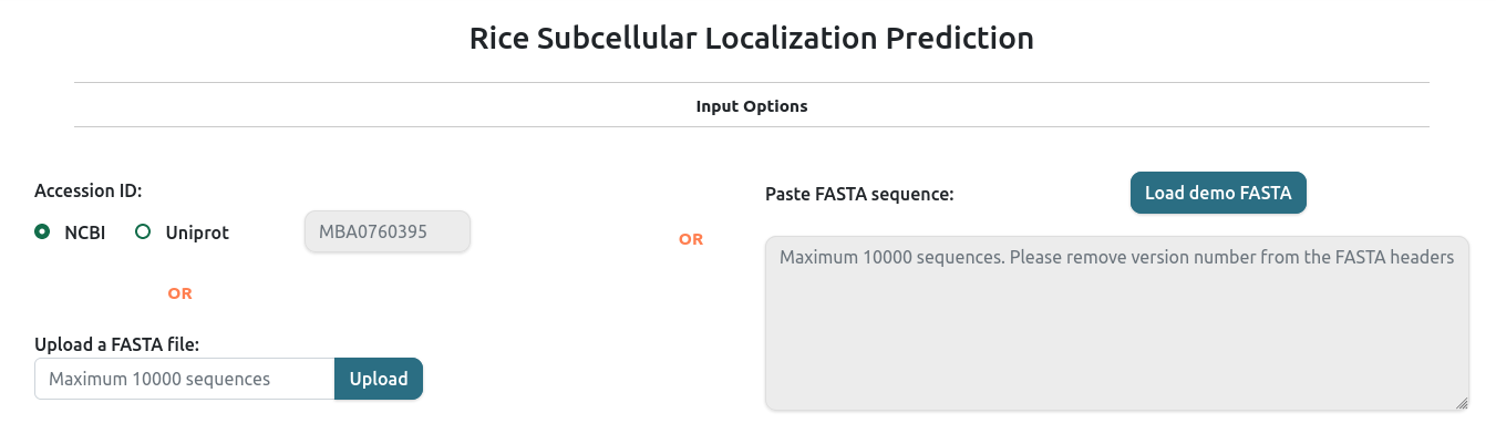 RSLpred-2.0 supports FASTA format. You can either upload a file or paste your sequences in the text area below or provide NCBI/UniProt accession in the text box below. You can also upload a list of accessions (one per line or comma/space separated). You can upload amino acid sequences after selecting appropriate query sequence type below.