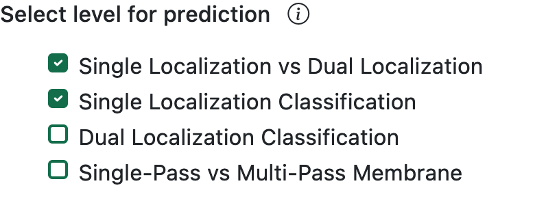 RSLpred-2.0 runs four levels for Oryza sativa Subcellular Localization prediction. Users can select any level for prediction and their preceeding levels will be automatically selected. All levels will run by default. There is an icon with general information about the tool and a brief explanation on how it works.