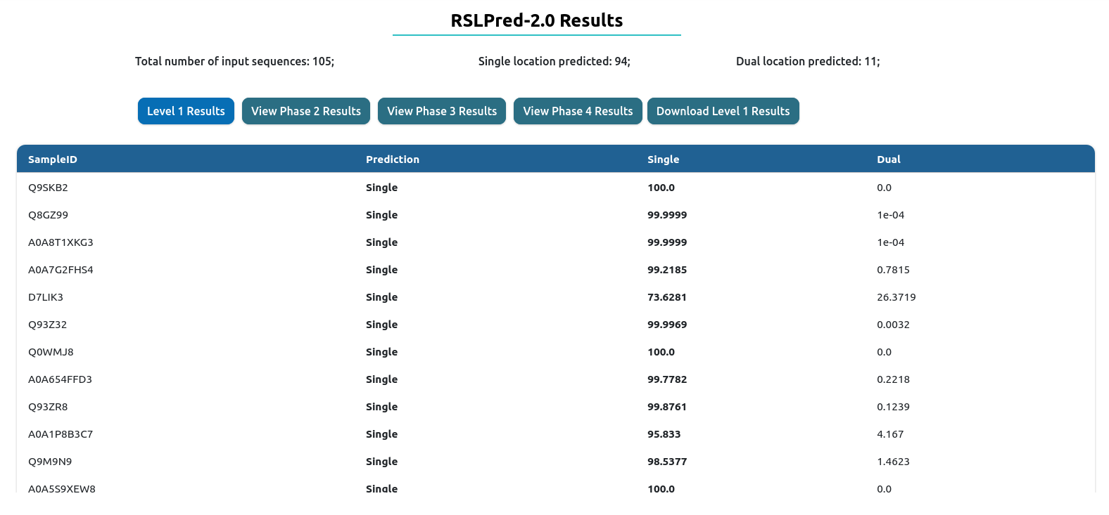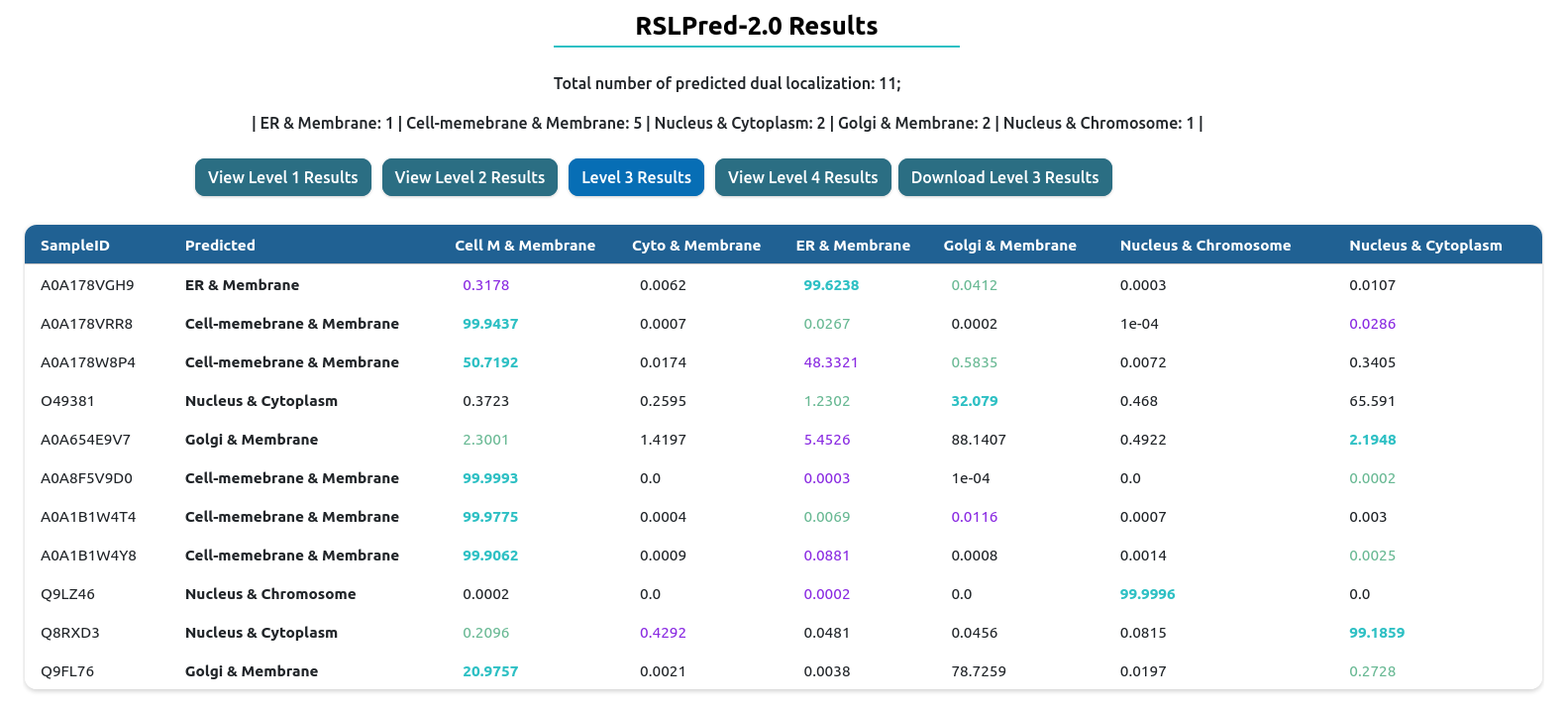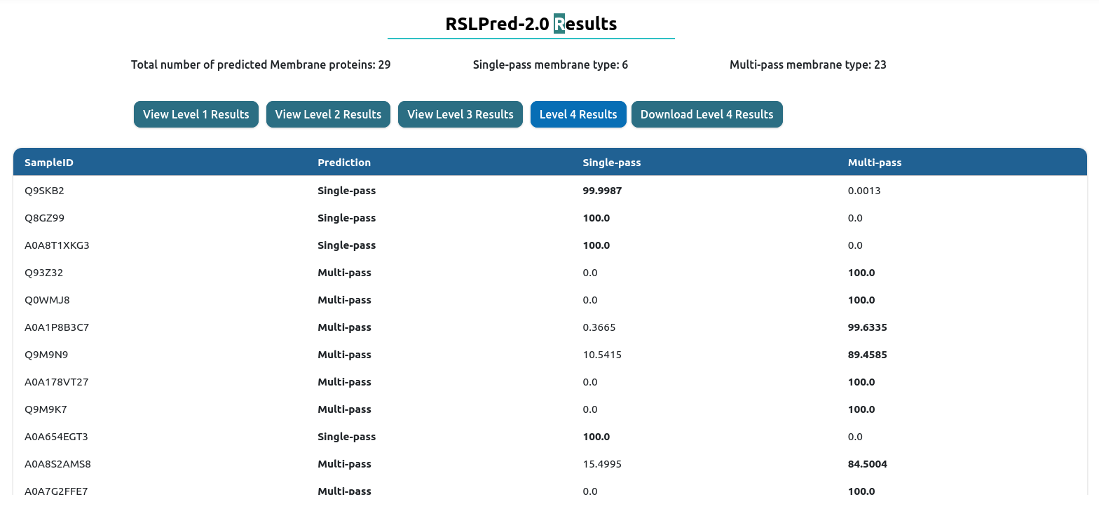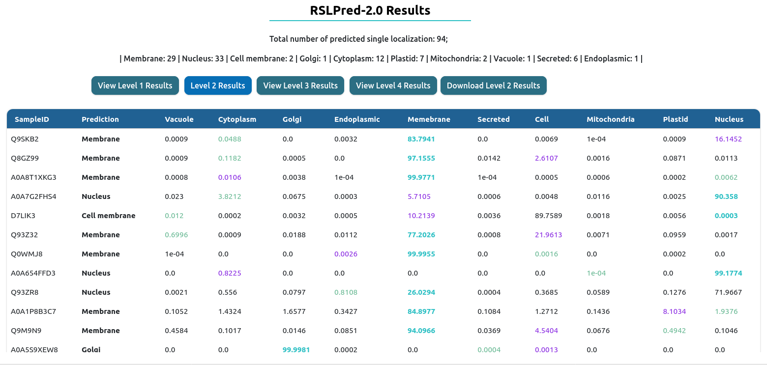 The result table will change depending of the prediction level used. On the top, you will have download results button, which download the comprehensive table result in tab-delimited format.